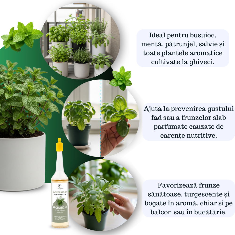 Pentru plante aromatice viguroase și pline de arome: tratament nutritiv pentru toate tipurile de plante aromatice (busuioc, mentă, rozmarin etc.), ideal în caz de creștere lentă, frunze palide sau dezvoltare slabă; oferă un efect vizibil imediat și de durată, timp de până la patru săptămâni.
