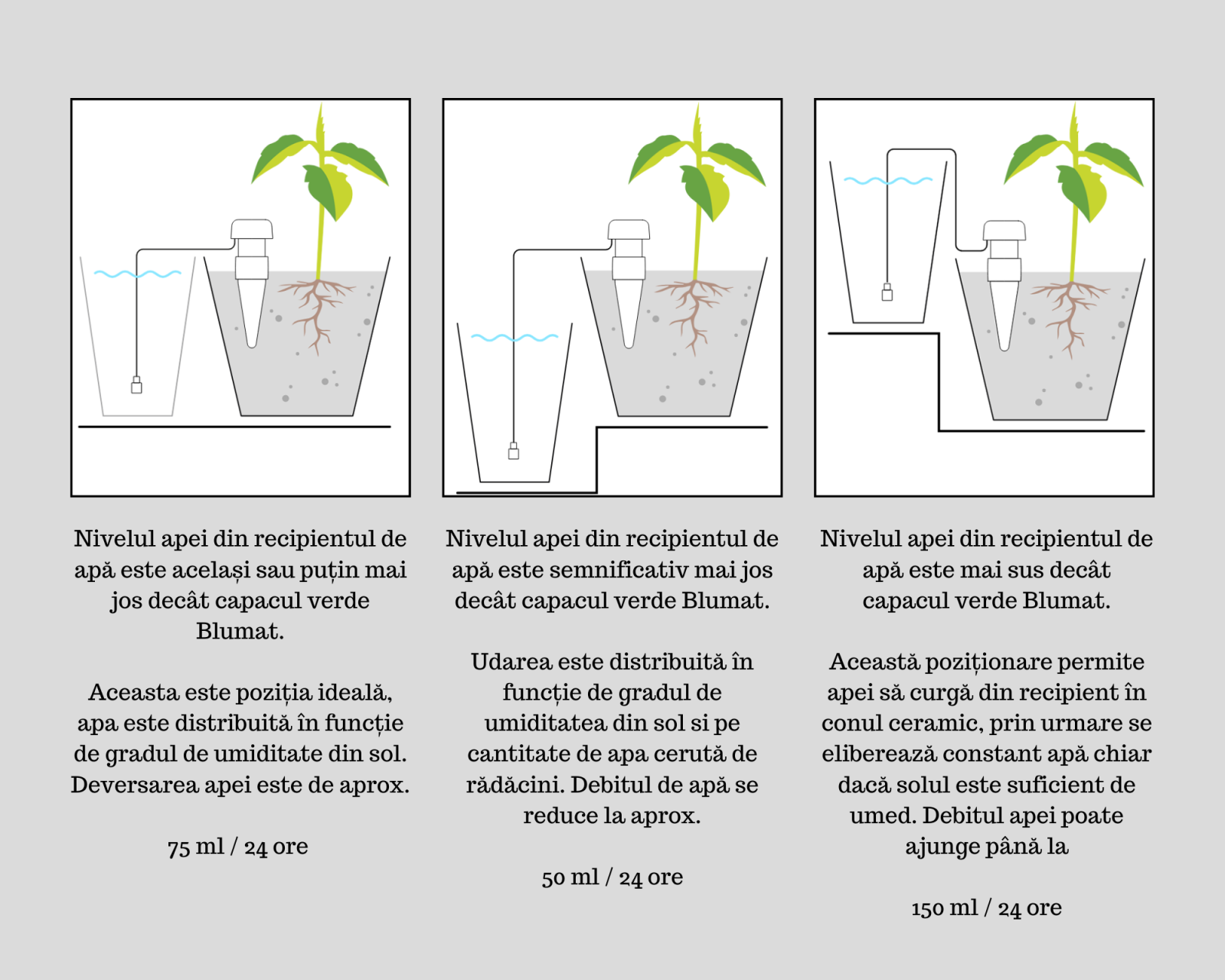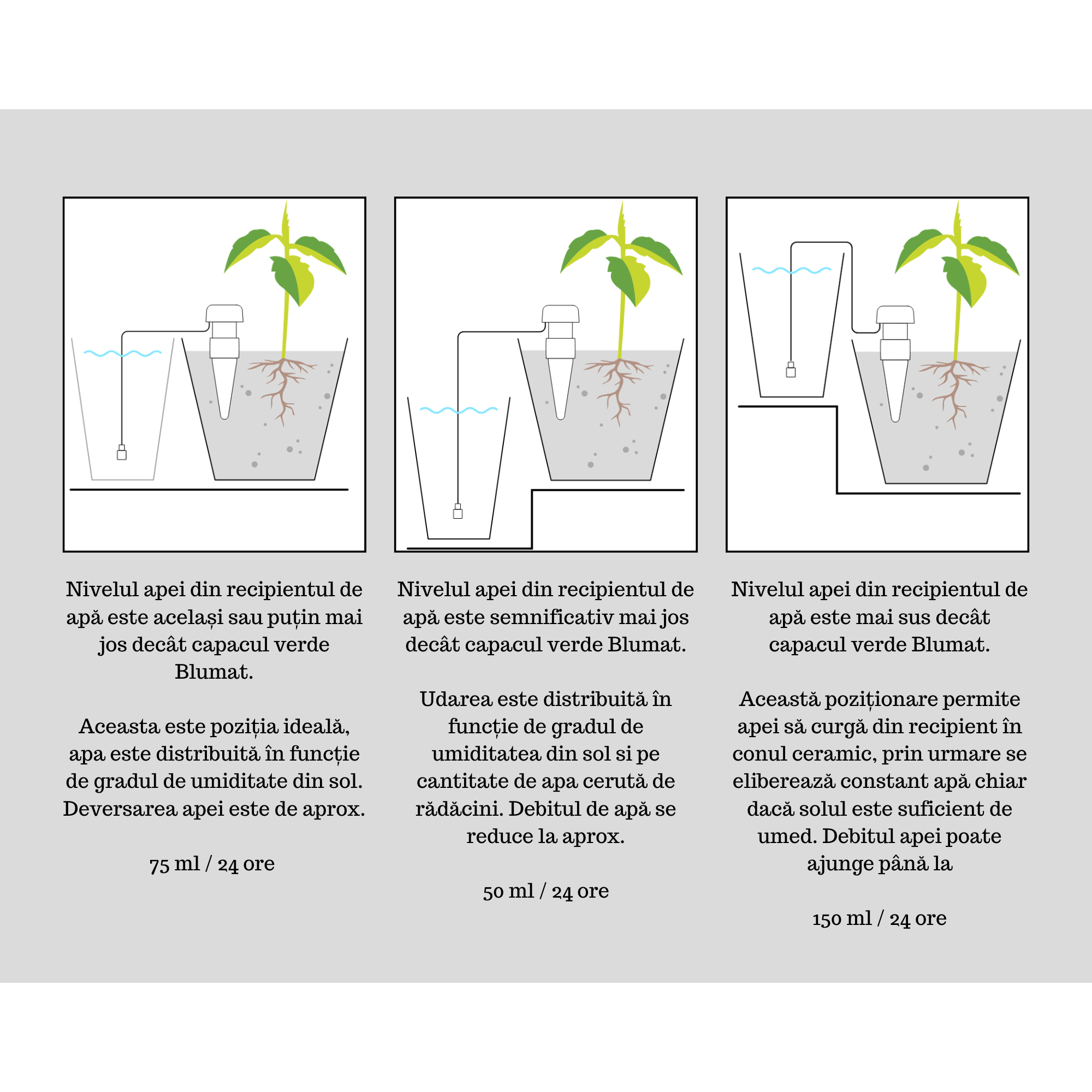 Cu Blumat Classic, plantele de interior primesc doar cantitatea de apa de care au nevoie. Indiferent daca este o locatie insorita sau umbrita. Apa este extrasa din orice recipient printr-un tub subtire si eliberata direct prin conul de lut pe planta. Modelul xlassic cu con de argila elibereaza mai multa apa si este ideal pentru plantele de interior mai insetate sau pentru a uda plantele de pe balcon si terasa atunci cand sunteti in vacanta.
